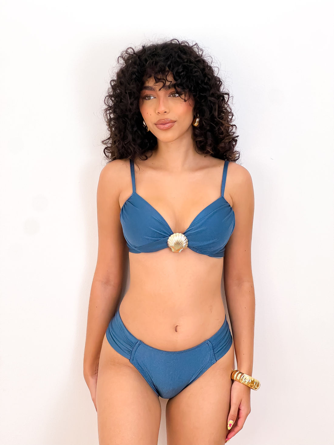 Os artigos exclusivos são banhados a ouro e adicionam um toque refinado e contemporâneo ao design, transformando a peça em um verdadeiro destaque da moda praia.