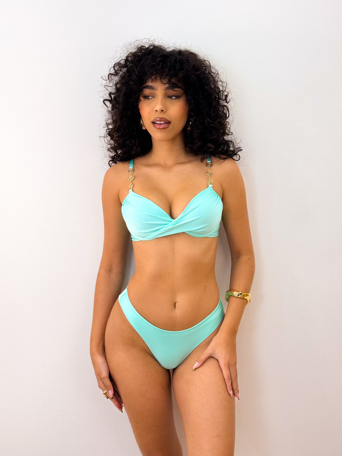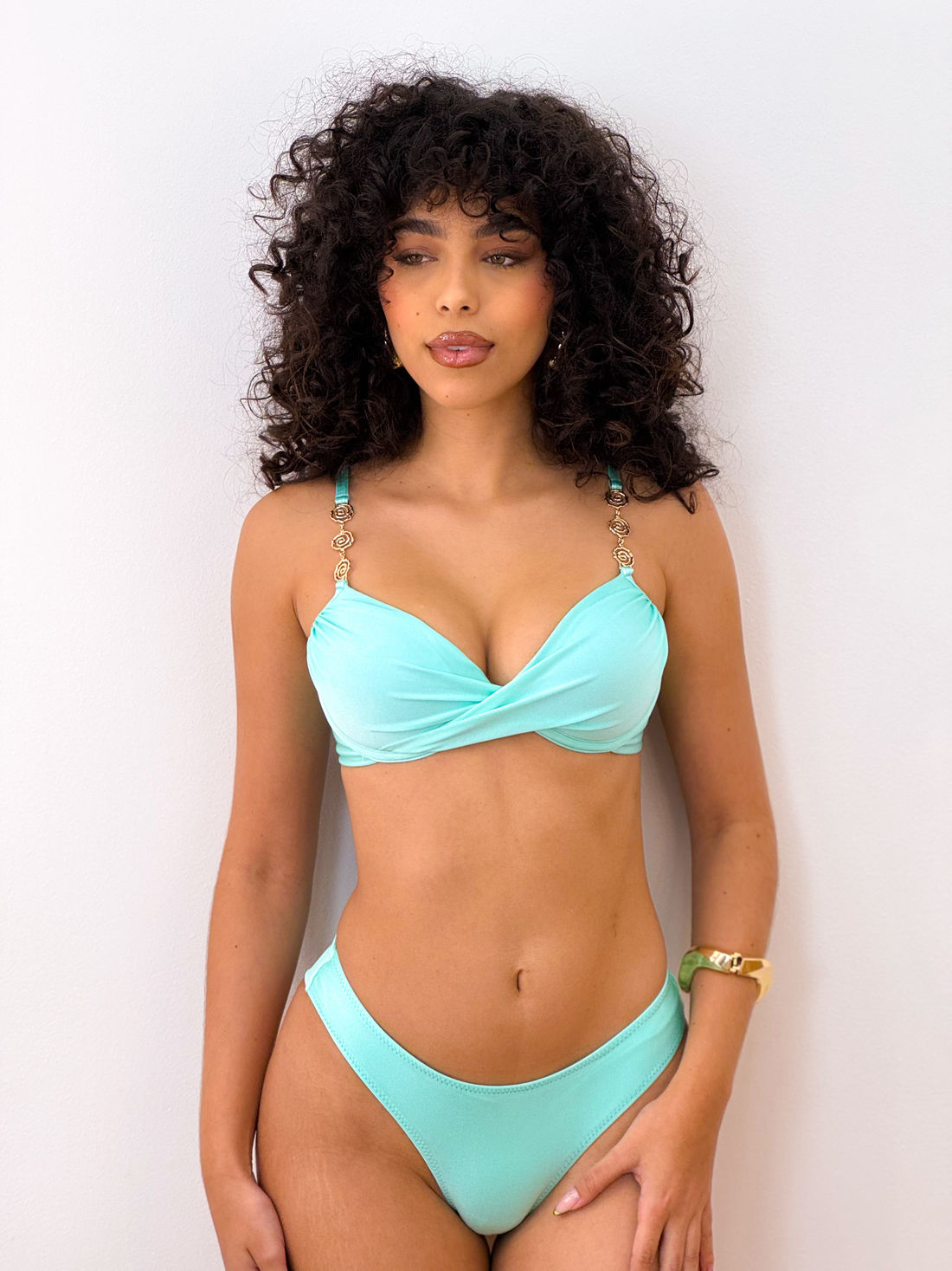 Os artigos exclusivos são banhados a ouro e adicionam um toque refinado e contemporâneo ao design, transformando a peça em um verdadeiro destaque da moda praia.