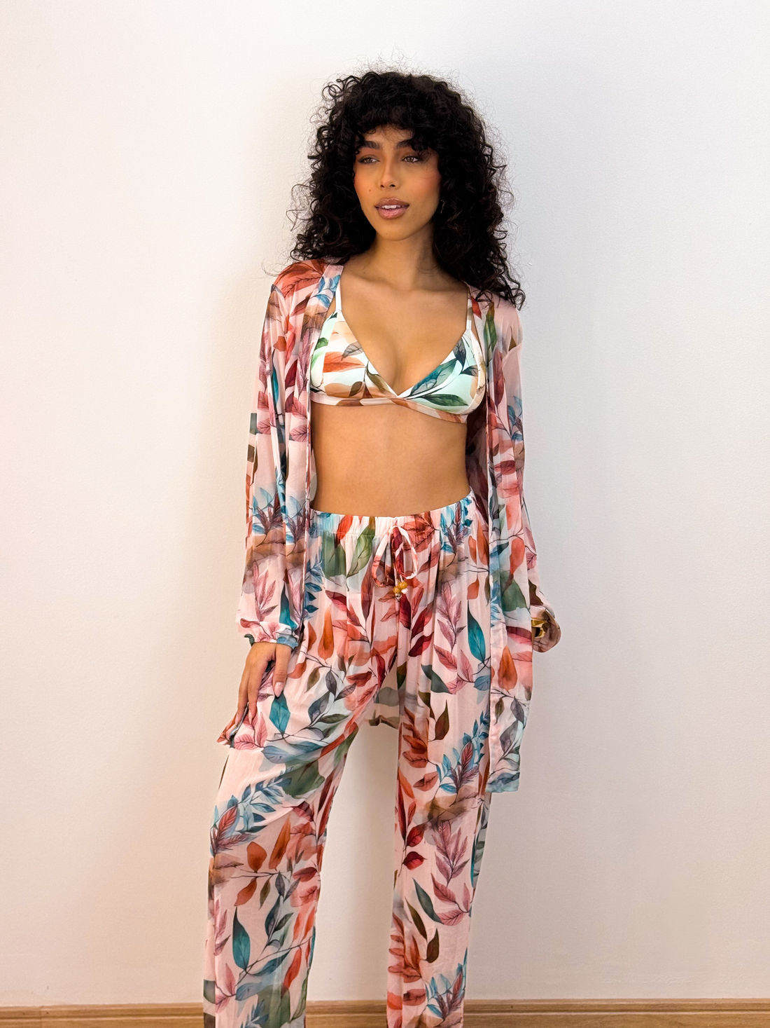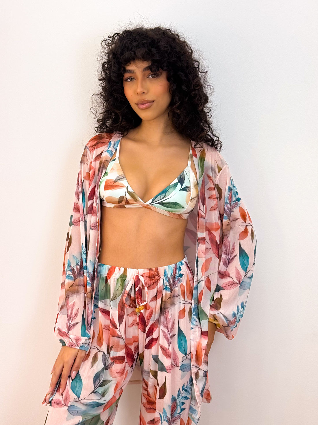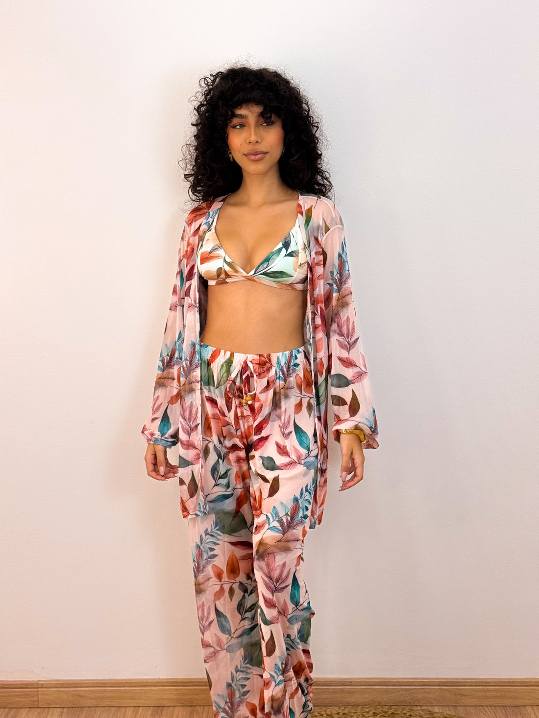 O kit Maresias é composto por duas peças essenciais: um quimono de mangas longas e uma calça.