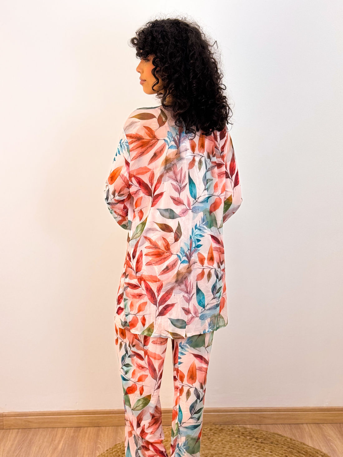 O quimono, com seu caimento fluido, proporciona um toque de elegância. Suas mangas longas e o design aberto na frente permitem um visual moderno. A calça complementa o look com sua modelagem ampla, garantindo conforto e praticidade.