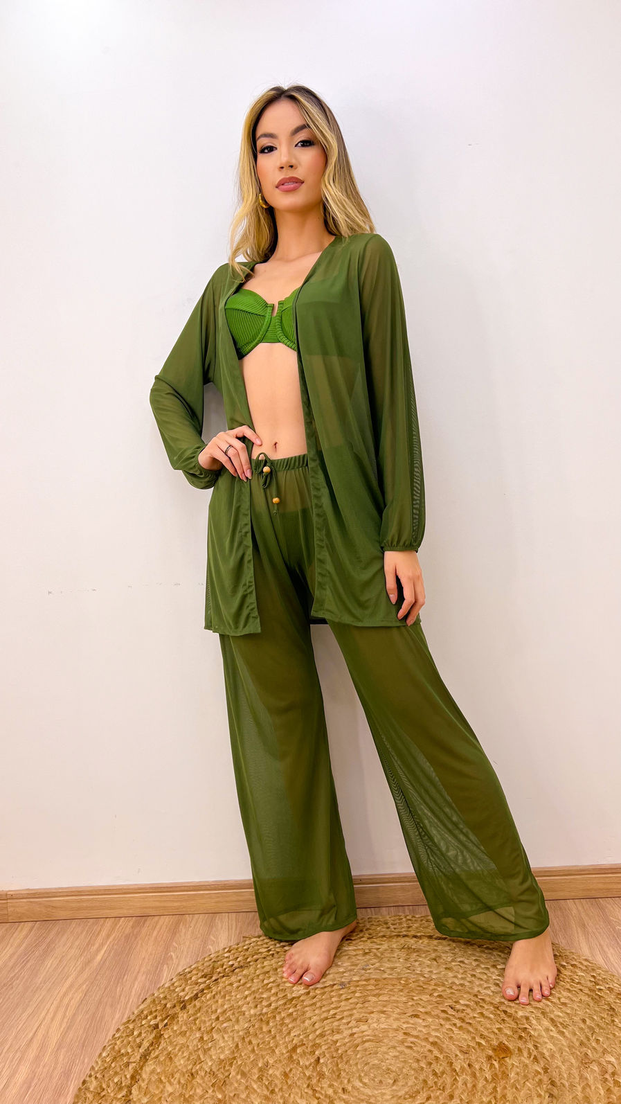 O kit Maresias é composto por duas peças essenciais: um quimono de mangas longas e uma calça.