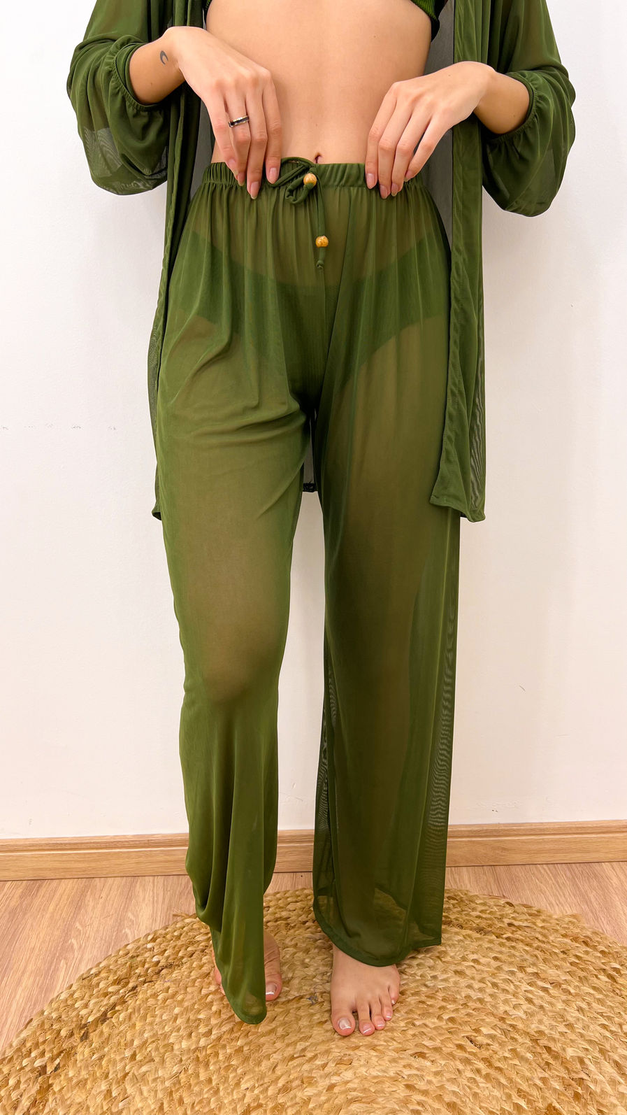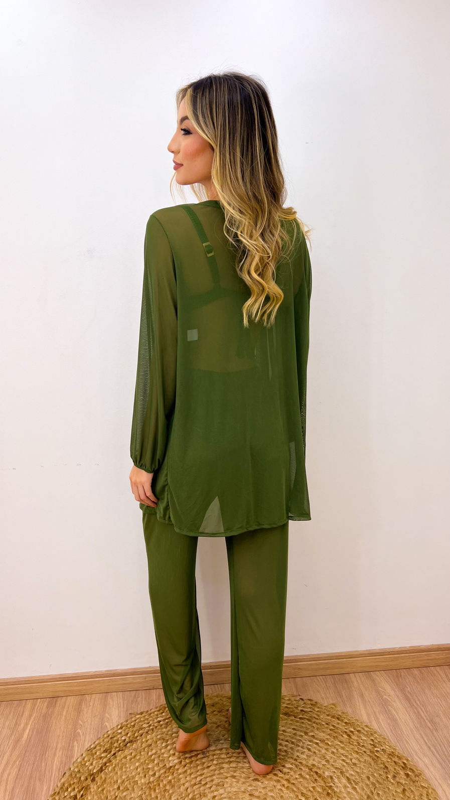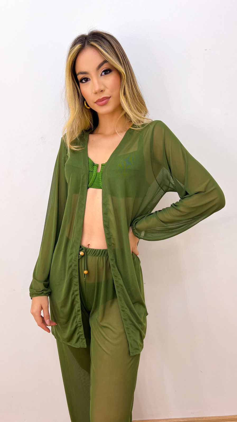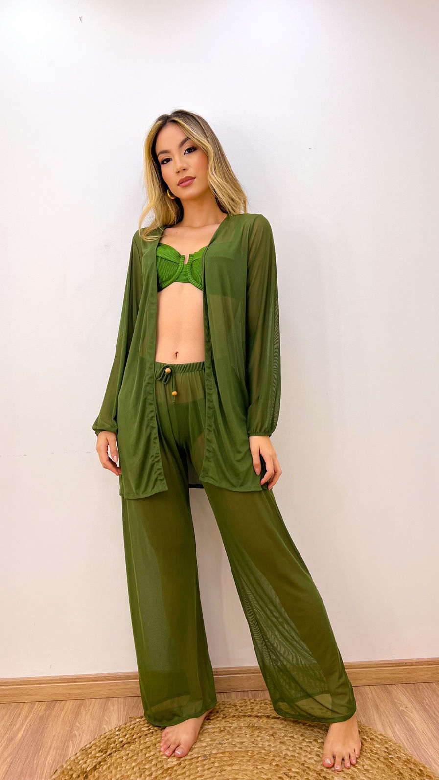 O tecido illusion combina leveza e elegância com uma transparência sutil que garante um visual sofisticado e moderno, este tecido é suave ao toque e oferece um conforto, proporcionando um look chic e despojado à beira-mar ou na piscina. Este kit de quimono e calça é a peça-chave para um look de verão impecável.