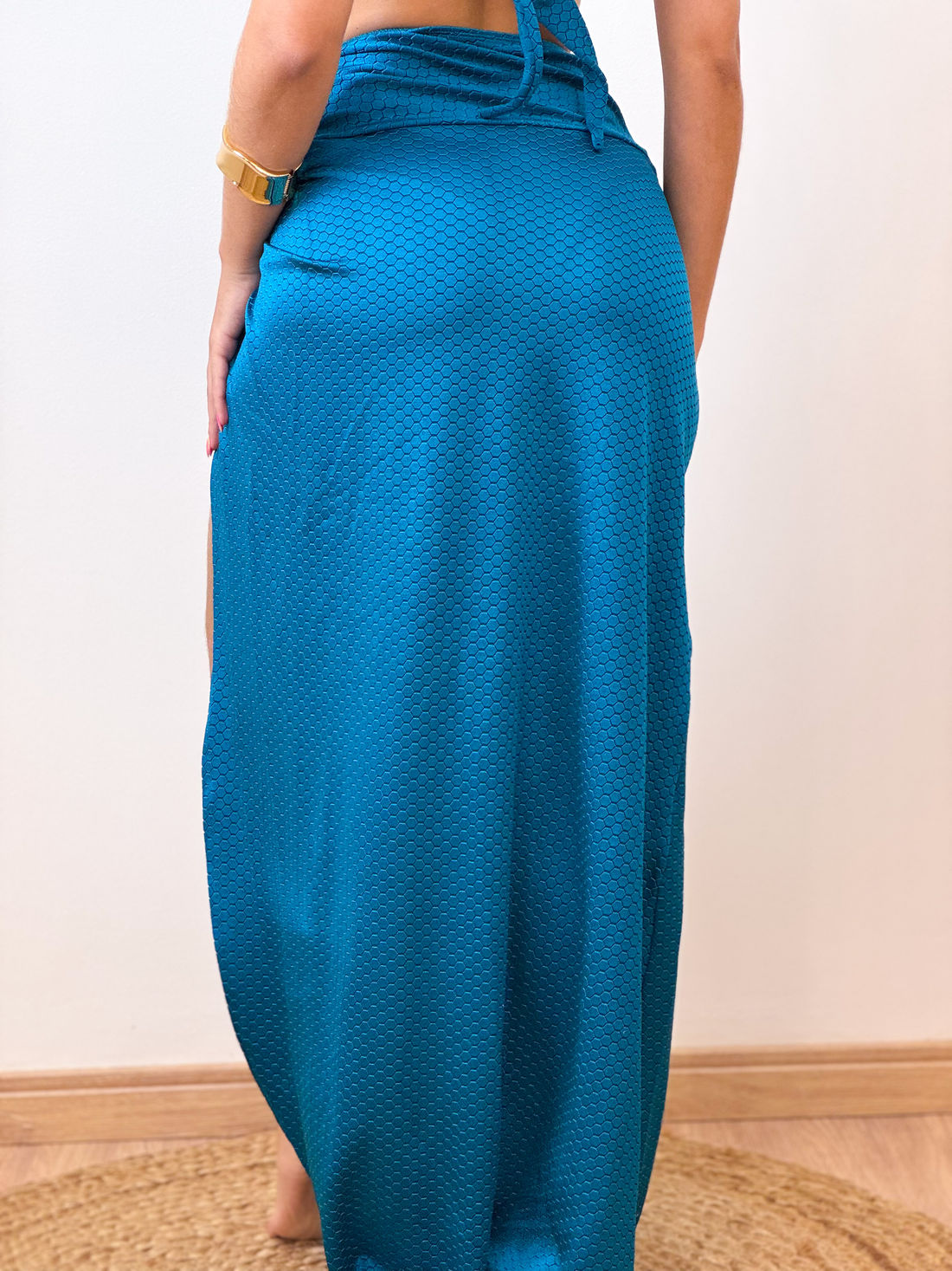 Modelo de saia longa com cintura alta, cós transpassado e detalhe de fenda.